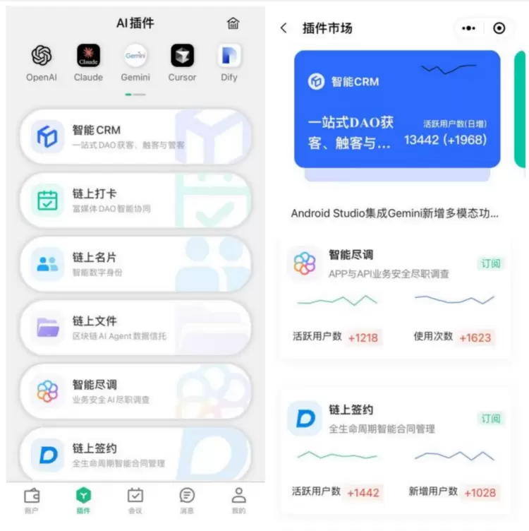 图 2通付盾链上会AI插件平台(左)、AI Agent插件市场(右)
