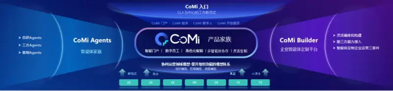 作为致远互联战略级AI载体,新一代智能体产品家族CoMi Family正式亮相。CoMi包括四层结构、五大特性,覆盖从底层技术到上层应用的全链路能力。四层结构:CoMi入口(门户/数字人/助手/开放服务)、CoMi Agents(自研/第三方/客户定制Agents)、CoMi Builder(企业智能体定制平台)、协同运营领域模型(组织/权限/流程/任务/决策模型)。五大特性:智能门户、数字员工、角色化智脑、多智能体协作、灵活定制。