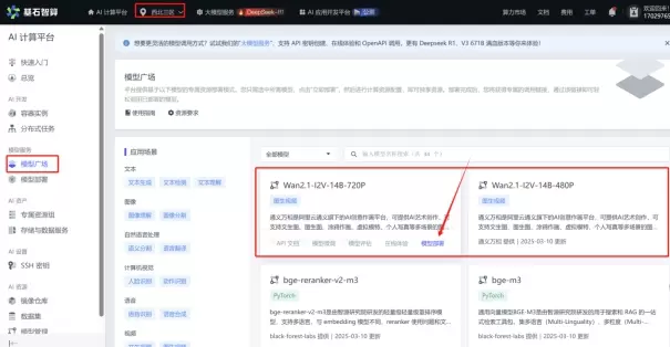 第一步:登录 Coreshub,进入 AI 算力平台—西北三区—模型广场,选择 Wan2.1-I2V 模型,根据需求选择不同规格,点击“模型部署”。