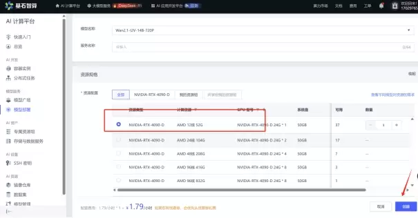 第二步:选择 1卡 4090 资源,点击“创建”即可完成模型部署。