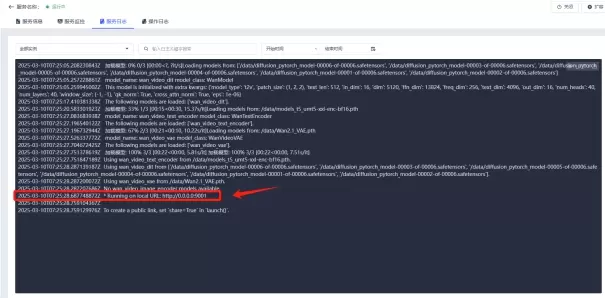 如果模型没有启动成功,外网链接不能打开,可以点击服务日志,当出现*Running on local URL: http://0.0.0.0:XXXX,即为模型加载成功。