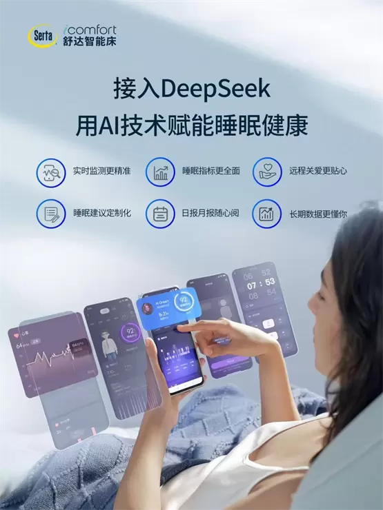 2025年3月,全球智能睡眠领域的前沿品牌舒达(Serta)在年度经销商高峰论坛上正式宣布,正式接入DeepSeek的AI技术,用于帮助消费者解读iComfort舒达智能床的睡眠报告。这是继2024年舒达率先发布AI智能床的NICE标准(Natural绿色环保、Intelligence智能进化、Comfortable舒适体验和Expansion生态互联)后,在4.0 AI智能床时代的又一重要举措,标志着舒达在智能睡眠领域的技术创新再上新台阶。