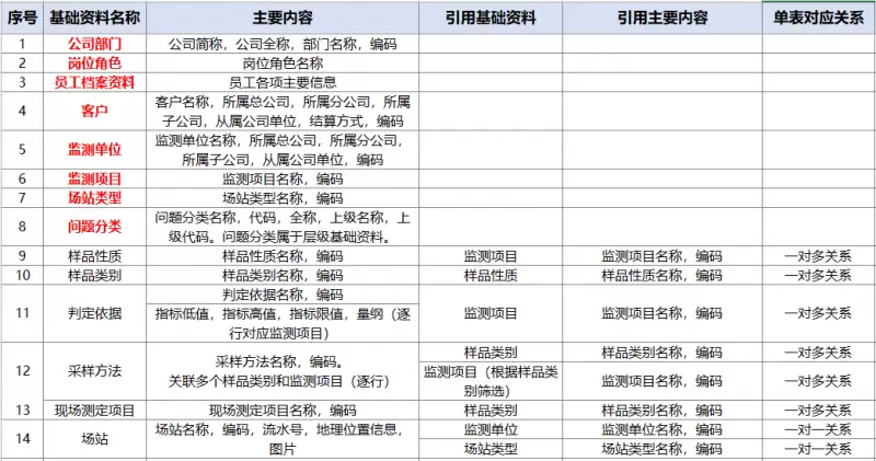环保和产品气监测业务,涉及的基础数据非常多,基础数据之间又相互引用、关联,可谓牵一发而动全身。所以基础数据管理的架构设计非常重要关键,设计得好,系统后期的使用维护,才能既方便快捷,又满足实际业务的需要。系统基础资料逻辑关系梳理如下表: