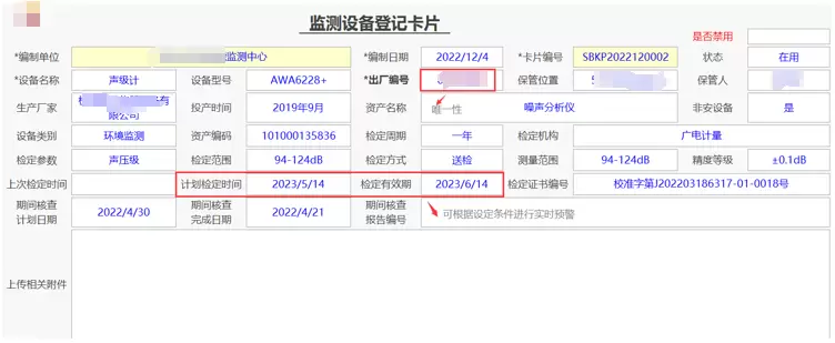 每台监测设备关联多个监测项目和对应的检测方法。可以上传设备相关附件资料和图片。