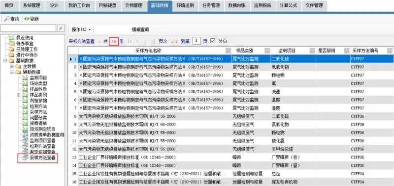 目前系统上共有采样方法7个,采样方法&监测项目79个。
