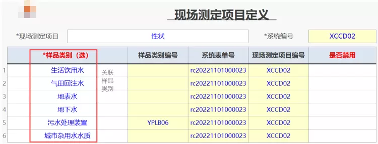 监测结果登记表关联监测任务通知单相关内容生成,由于不同样品类别的监测结果数据内容和格式有差异,所以系统设计了5种类型的监测结果登记表。
