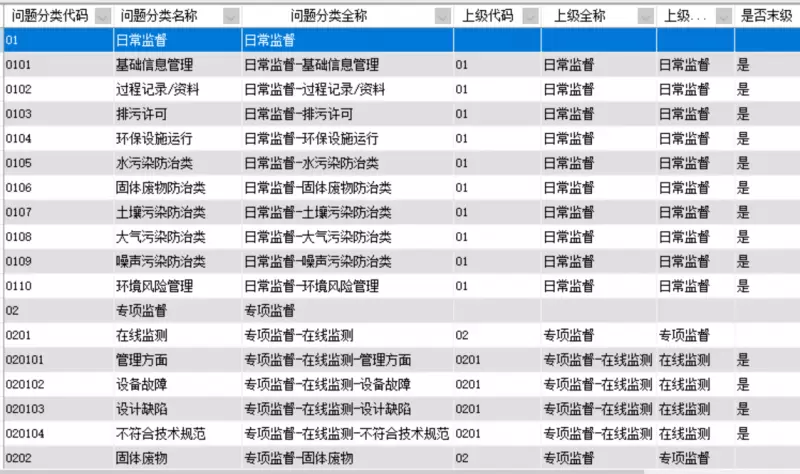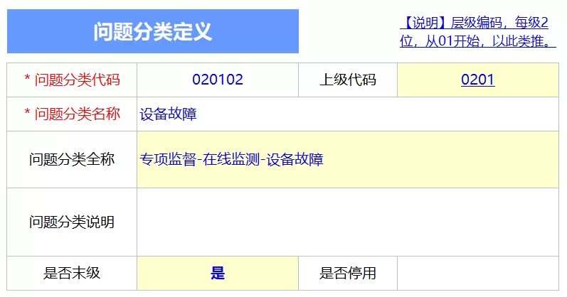 问题分类是层级架构,即有父级问题分类和子级问题分类。每个层级的编码长度均为2位,从01开始,以此类推。业务发生时,只能选择末级问题分类。