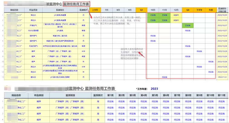 系统分为月工作大表和周工作大表,实质上是一张表。月工作大表包含监测周期有:月份、季度、半年和年度;周工作大表仅包含监测周期为周的工作任务。