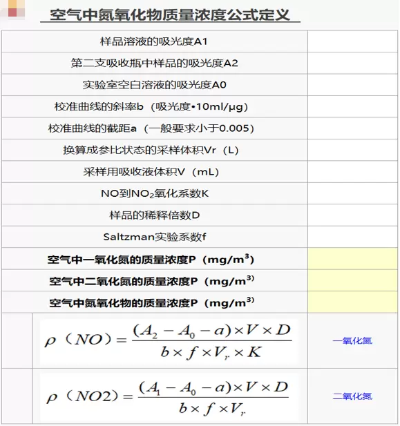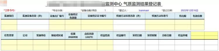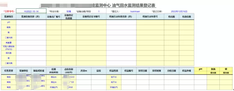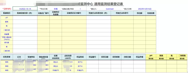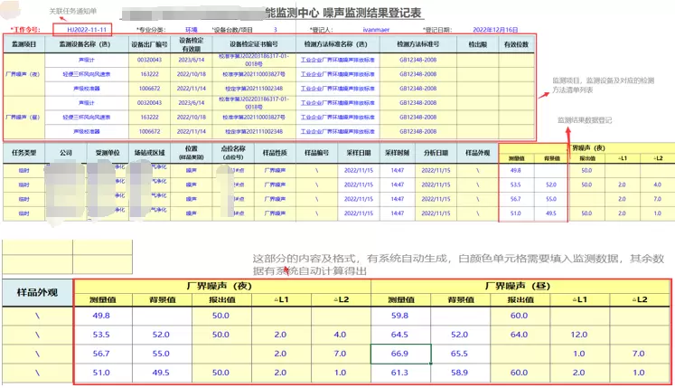监测结果登记表的主要内容都是系统自动从监测任务通知单和监测任务登记单上获取过来,包括需要登记监测数据的监测项目和监测内容,都是系统自动匹配生成的,计算公式也是由系统自动带入生成。填报人员只需要填入白色单元格的相关数据即可。(以下同)
