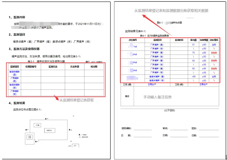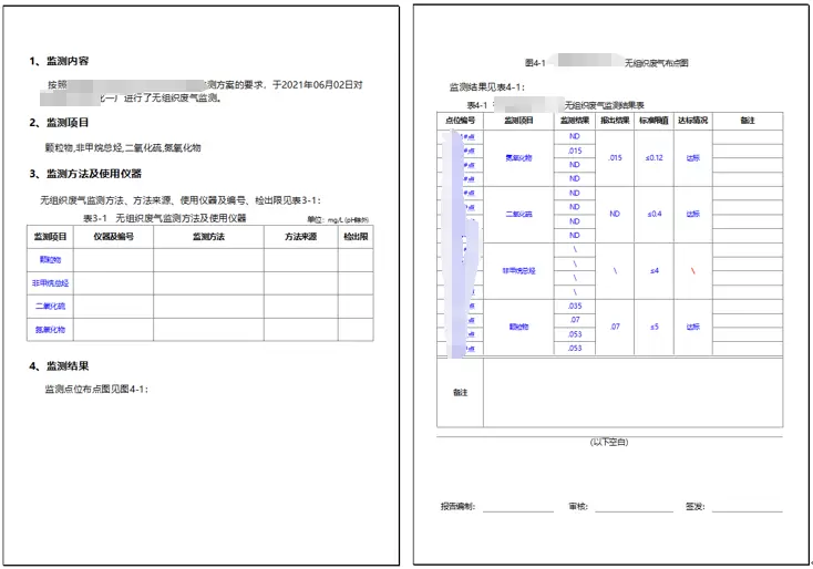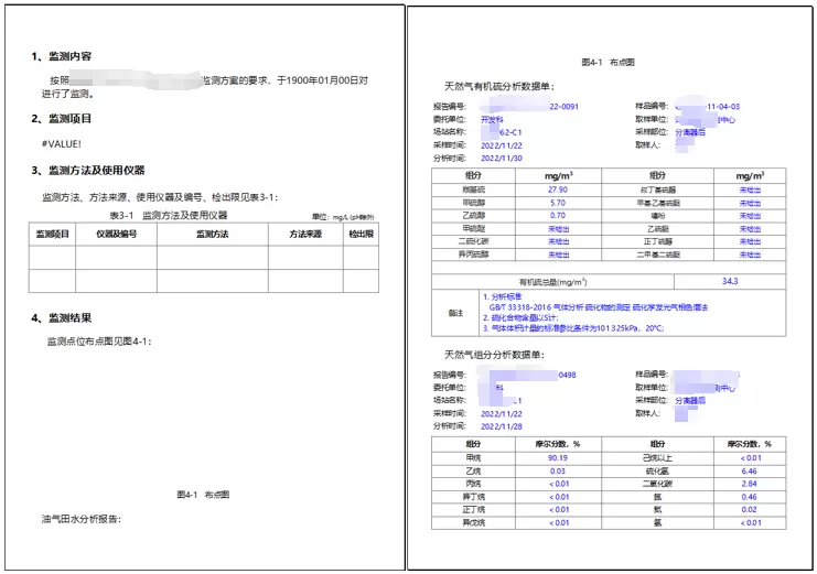 这是监测报告后二页。监测报告上几乎所有内容,均可由系统按照场站+样品类别+取样分析日期,从监测结果登记单和监测数据台账上自动获取。