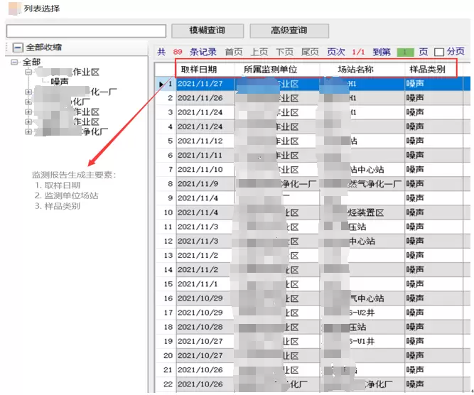这是监测报告前二页,所有监测报告这二页均相同。生成监测报告时,勾选被监测单位名称,选取场站+样品类别+取样日期。如下图: