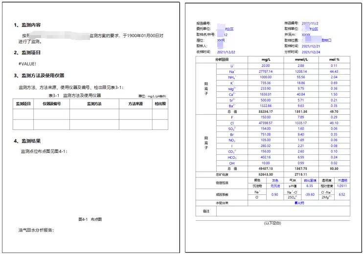 监测报告关联监测结果登记表及监测数据台账相关内容生成,历史监测数据监测报告直接由历史监测数据台账相关内容生成。监测报告按照场站+样品类别生成,由于不同样品类别的监测报告内容和格式有差异,所以系统设计了7种类型的监测报告。