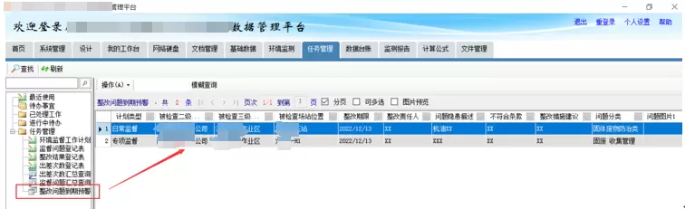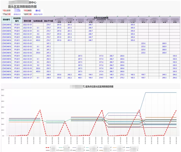 监测数据台账分为二大部分:一是在系统上线之前的历史监测数据台账,按照模板整理后集中导入系统;二是上线后,系统根据监测结果登记表的数据自动生成的监测数据台账。