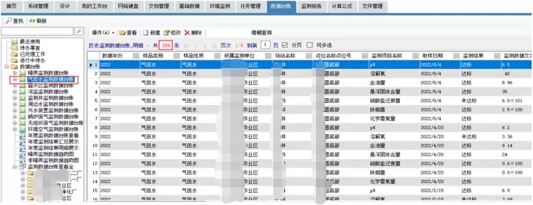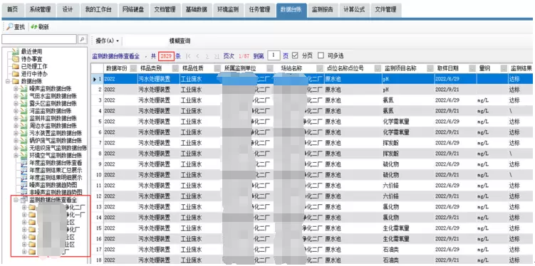 监测结果数据登记表保存提交后,系统自动生成监测数据台账。