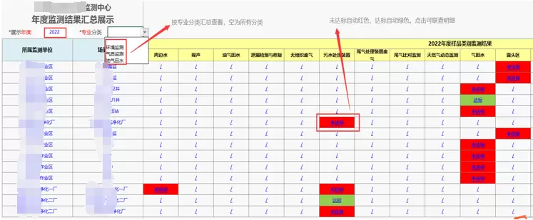 按任意年度+专业分类对监测结果数据汇总展示,并可联查监测结果明细数据。