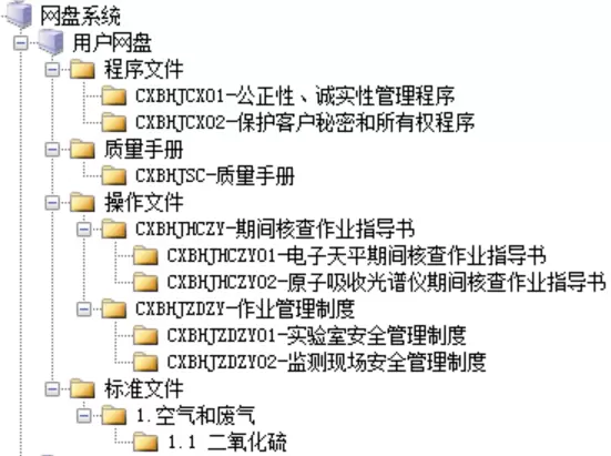 经过梳理确认,文档目录按照大类逐级向下,目前有四个大类:质量手册、程序文件、操作文件和标准文件。每个大类下均采用编号+文件名称的方式逐级建立目录,最终每一个实体文件对应一个文档目录,直观清晰。