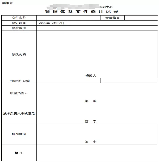文件需要修订时,填写文件修订记录单,包括修订的文件编号和名称、修订的主要内容、上传相关附件等,按照设定的审批流程进行线上审批。