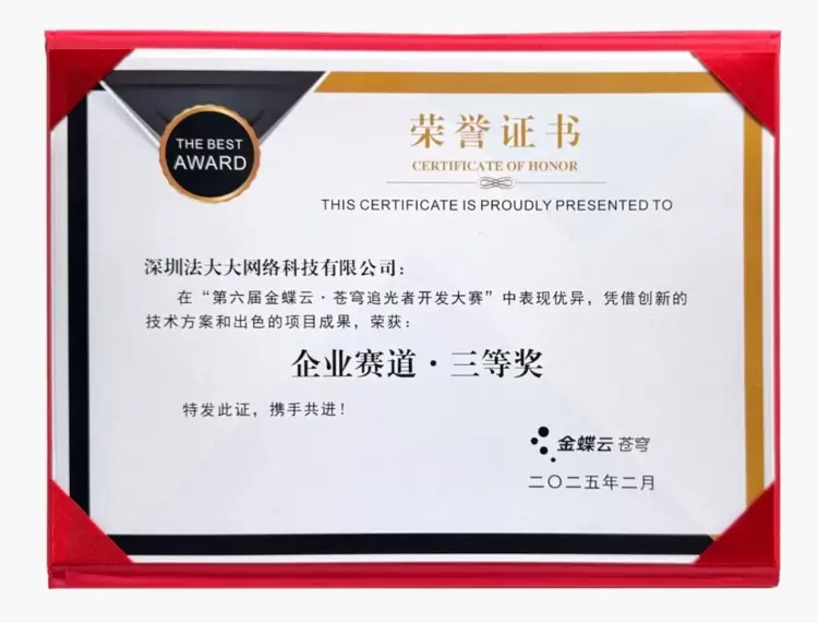 近日,第六届金蝶云・苍穹追光者开发大赛颁奖典礼在西安盛大举行。法大大凭借卓越的技术实力及创新解决方案,从众多参赛企业中脱颖而出,荣获大赛三等奖。作为电子签行业唯一获奖企业,这一荣誉充分印证了法大大在赋能企业数字化转型领域的技术实力和创新能力。