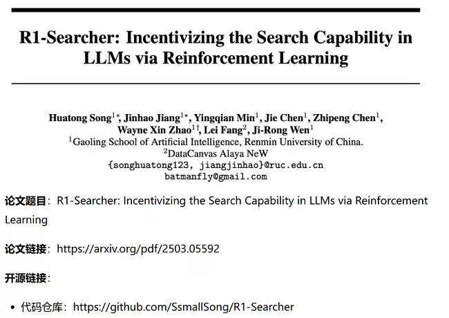 近日,中国人民大学STILL项目团队、九章云极DataCanvas研究人员联合发布新技术论文称,提出了一种全新的强化学习方法R1-Searcher。据官方论文介绍,这是一种用于AI大型语言模型(LLMs)可自主调用外部搜索系统且可通过模型自我学习进行训练的强化学习(RL)方法,通过两阶段奖励机制(何时检索 + 如何利用)解决了现有模型处理知识密集型问题时的不足,在多跳问答、实时信息处理等场景展现出颠覆性潜力。