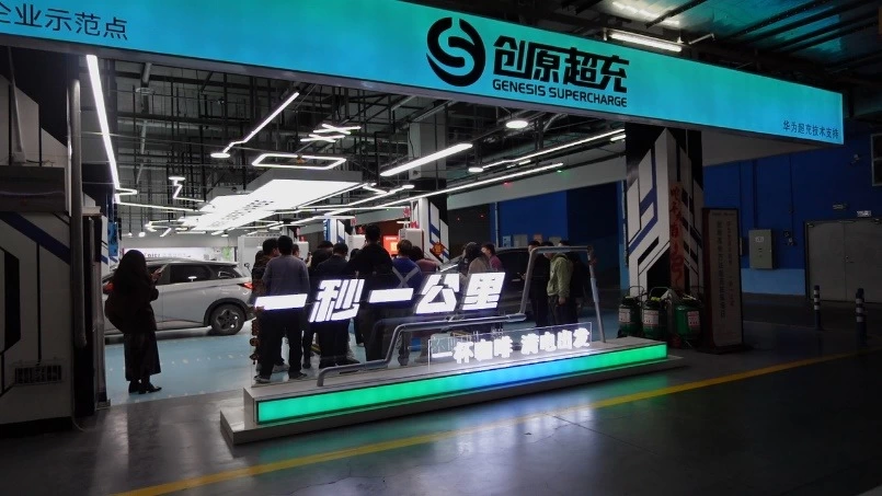 位于西安高新区万达广场的超充站于2024年9月建成使用,采用了华为全液冷超充终端,配备600KW直流充电桩,共有24个车位。据陕西创原智慧电力科技有限公司创原超充充电网络负责人王睿知介绍,华为全液冷超充系统最大输出功率600kW,最大电流为600A,支持200-1000V的宽压范围,可以适配所有市面上的新能源车型。“最大特点就是‘快’。”技术人员说,“以标称500公里续航的新能源车为例,由于强制保电20%,实际续航在400公里左右,用华为全液冷超充,5分钟就能补300多公里,真正做到‘一秒一公里’。”