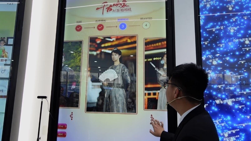 在长安十二时辰主题街区,全仿古的内部装饰让游客们连声赞叹,很多人都换上了古装汉服游逛,乐在其中。在一个角落,很多游客在AI旅拍一体机(换装相机)前排起了长队。记者看到,游客面对摄像头拍一张照片,瞬间会生成一张身着古典服装的全妆照片。据工作人员介绍,这个一体机通过人脸识别算法+图像大模型支撑,可以根据李白、花魁等人物形象生成栩栩如生的照片。一键换装、穿越千年,AI的魅力确实不可抵挡。