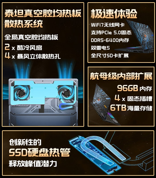 微星超增压模式 Ultra,整机可以达到 270W 的双烤性能释放,机身内部的豪华散热也得到进一步升级加强。泰坦真空腔均热板散热系统,拥有强大的解热能力。值得一提的是,出厂还预装了超高速 PCIe 5.0 固态,并专门为 SSD 单独提供热管散热,进一步释放性能并保障长期使用的稳定性。