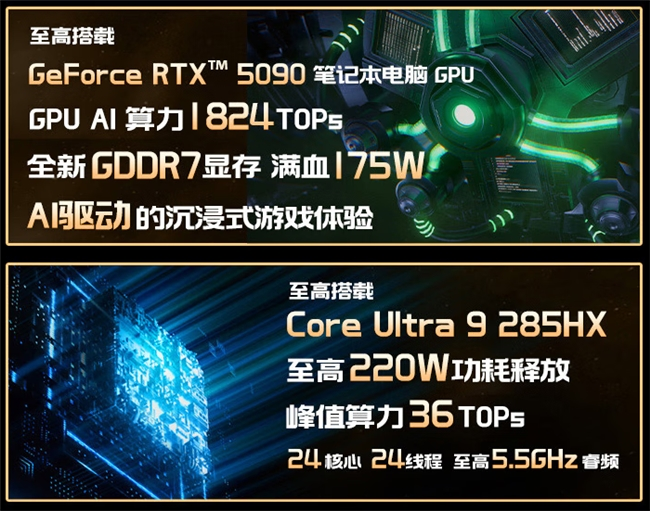CPU 至高搭载英特尔酷睿 Ultra 200HX 的旗舰型号:Ultra 9 285HX,8 个性能核心+16 个能效核心,组成 24 核心 24 线程的强大核心规模,至高睿频可达 5.5GHz。凭借着显著提升的能效表现,至高也可达到 220W 功耗释放,无论是单核爆发还是多核生产力表现,也都相当令人期待!