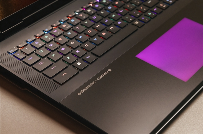 键盘外设方面,Cherry MX 超薄机械键盘轴体 + 赛睿单键 RGB 背光灯效的强强联合,不仅可以提供爱不释手的爽快操作手感,自定义灯效的丰富可玩性,匹配笔记本掌托上的无缝 RGB 触控板,营造出众的游戏氛围。掌托部分为玻璃材质,触感温润顺滑,如需低调也可关闭灯效,掌托浑然一体,高级感十足。