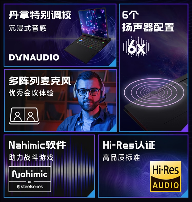 音频部分的配置,采用经过丹拿特别调教的 6 扬声器设计,并支持 Hi-Res 认证,声音外放效果拔群。玩家和影音爱好者,还可以通过 Nahimic 音效软件,进行不同 EQ 和音色喜好的调教,带来更个性化的听音体验。