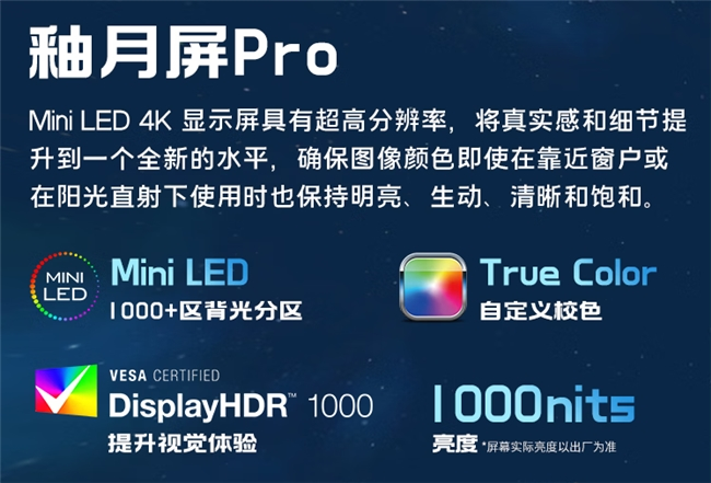 屏幕也同样采用 18 英寸的 Mini LED 4K 大屏,120Hz 高刷+ 100% DCI-P3 专业广色域,应对游戏和专业内容创作都轻松拿捏。而峰值亮度 1000nits 不仅在强光下也清晰可见,1000+背光分区的 Mini LED 对于未来更多的 HDR 内容呈现也是做好了准备,相信无论是观影,还是在游戏中开启 HDR 效果,都将是一场令人流连忘返的视觉盛宴。