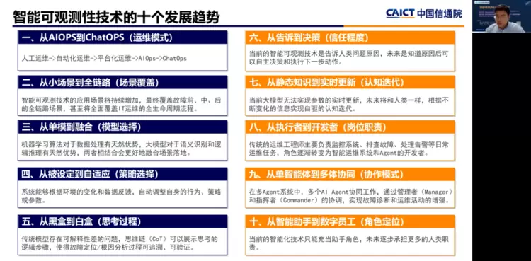 中国信通院云大所云计算部工程师 刘坤发表了《智能可观测性技术应用现状及发展趋势》主题演讲。他首先分析了在AI时代下推动可观测技术与智能化技术加速融合的多重因素,以及可观测技术与智能化技术结合的本质,中国信通院以标准化建设驱动行业交流并形成《云计算智能化可观测性能力成熟度模型》。他介绍了智能可观测性技术应用现状,包括数据治理、多个核心应用场景以及可观测智能体,最后,分享了智能可观测性技术的十个发展趋势,为与会者提供参考。