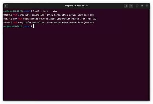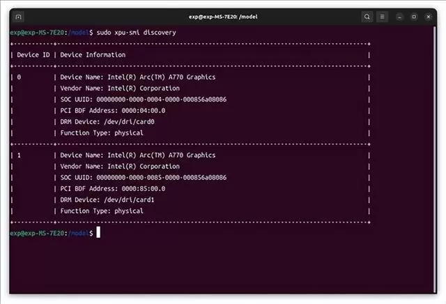 重启后,用lspci或者xpu-smi(这个需要额外安装)可以看到两张锐炫A770 16GB已经就位。至于多出来的那个non-VGA设备则是酷睿Ultra的NPU,不用去管它。
