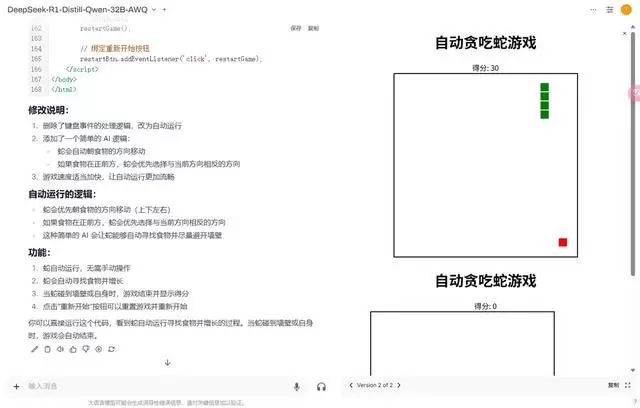 来看看它的运行速度。单个用户访问时,平均生成速度在26 tokens/s左右。在上图的演示里面,我们让它用HTML写了个贪吃蛇,完成后右侧就出现了窗口,可以马上进行游玩。另外,还可以根据需求叫AI修改代码,比如这次我叫它把贪吃蛇改成自动运行,这样截图会方便一点。