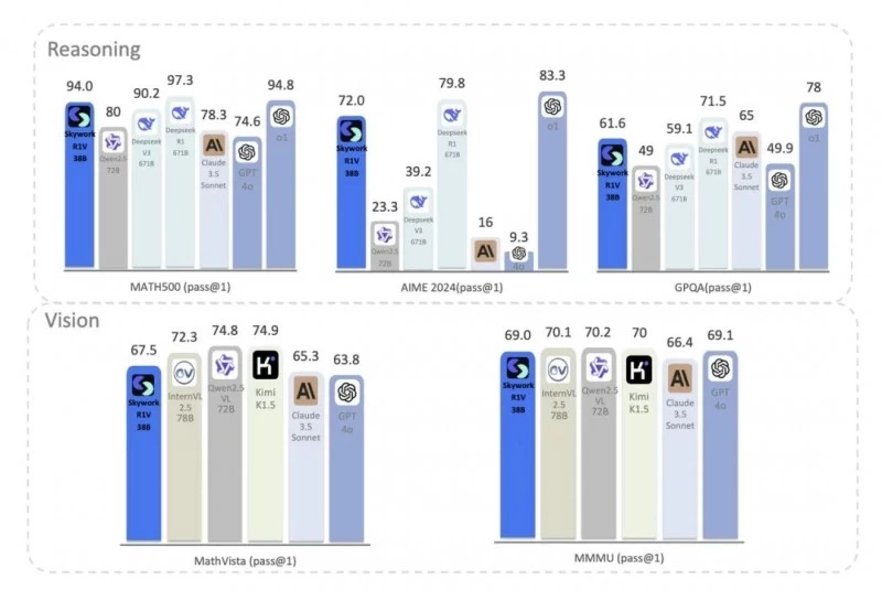 通过以上的训练策略,Skywork R1V在视觉推理任务上取得突破性进展,并在多个公开评测基准中达到或超过了现有领先模型的性能。