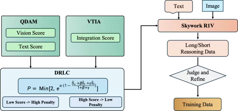 团队提出了一种基于视觉-文本复杂度的自适应推理链长度控制机制,动态优化模型推理过程,避免模型“过度思考”,提升推理效率。结合多阶段自蒸馏策略,进一步提升了数据生成与推理过程的质量,促进了模型在复杂多模态任务中的表现。