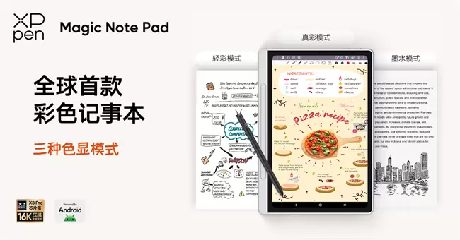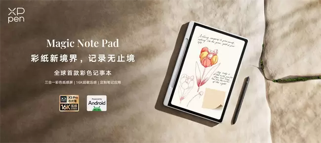 3月19日,全球数字芯片笔创新引领品牌XPPen重磅推出首款10.95英寸彩色记事本Magic Note Pad,其创新性融合行业首创三合一彩色纸感屏,16384级压感数字笔、定制化专业笔记应用XPPen Notes以及安卓14全开放系统,为商务办公、 学习笔记以及更丰富的创意绘写用户带来更开放高效、更护眼以及更能还原真实笔迹的全新写记体验,树立彩色记事本行业新标杆。
