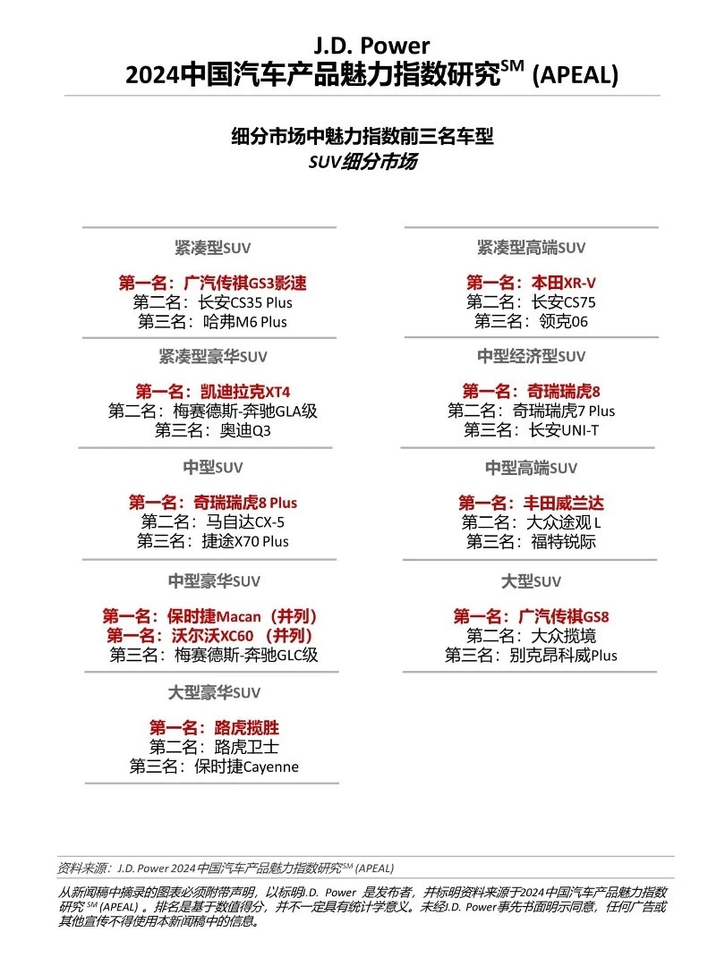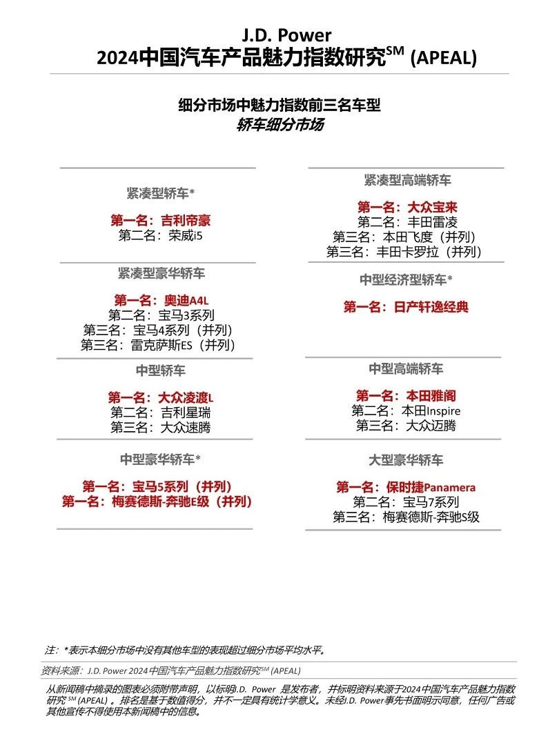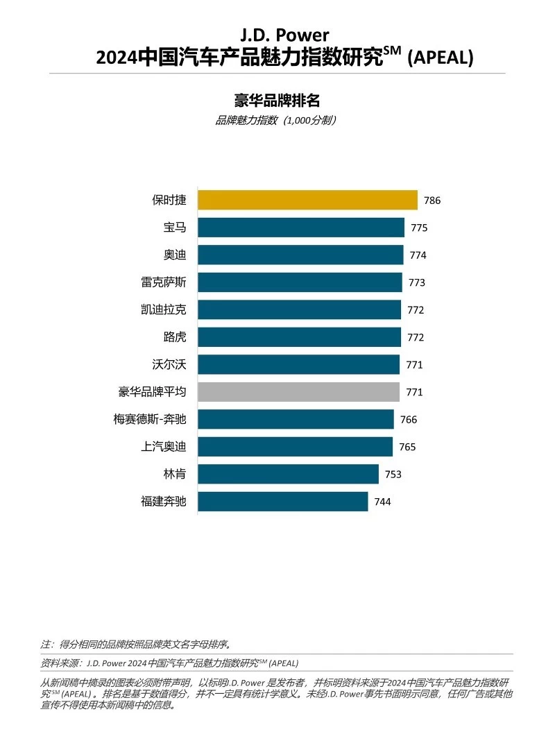 J.D. Power中国汽车产品魅力指数研究(APEAL)反映了燃油车新车车主在购车2至6个月内拥有和驾驶车辆的体验,整合出让新车购买者感到兴奋和欣喜的车辆要素设计组合,是汽车厂商设计和开发车辆的重要参考。2024年,中国汽车产品魅力指数研究(APEAL)基于32,728位传统燃油车车主的评价反馈,涵盖了48个品牌的221款车型。采取满分1000分制的评价标准,分数与产品认可度成正相关。2024年中国燃油车行业整体魅力指数为737分,豪华品牌的魅力指数为771分,较上一年上涨14分。保时捷(786分)获得豪华品牌第一,也是其十年来第九次荣膺该排行榜冠军。此外,保时捷Panamera在大型豪华轿车细分市场的产品魅力指数中位列第一,保时捷Macan成为中型豪华SUV细分市场魅力指数冠军。