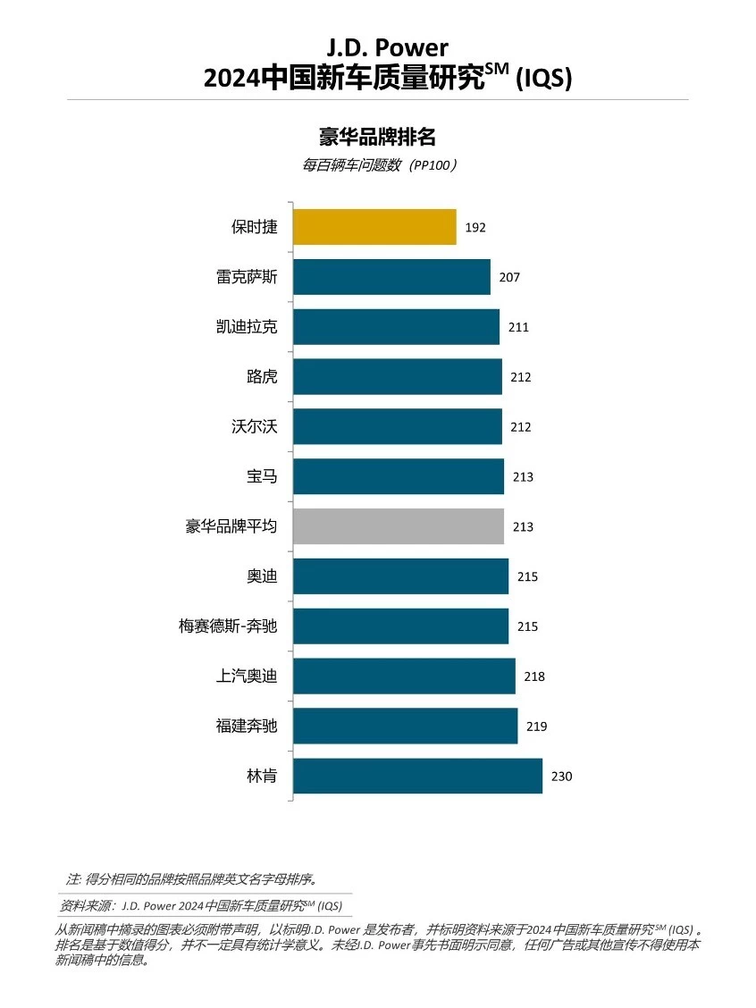 J.D. Power已在中国开展新车质量研究(IQS)25年。此研究主要以车车主(即拥车期2-6个月)遇到的产品质量问题为风向标来检验新车质量。本项研究基于31,942位燃油车车主的真实反馈。研究覆盖48个品牌的221款车型。新车质量以平均每百辆车问题数(PP100)表达,分值越低,表明问题数越少,质量也越好。2024年行业总体平均新车质量的每百辆车问题数为212个PP100,豪华品牌问题数平均为213个PP100,保时捷以92个PP100荣获豪华品牌新车质量排名第一。同时,这也是保时捷近十年来第九次摘得该项榜单冠军。保时捷Macan更是夺得中型豪华SUV细分市场新车质量的冠军。