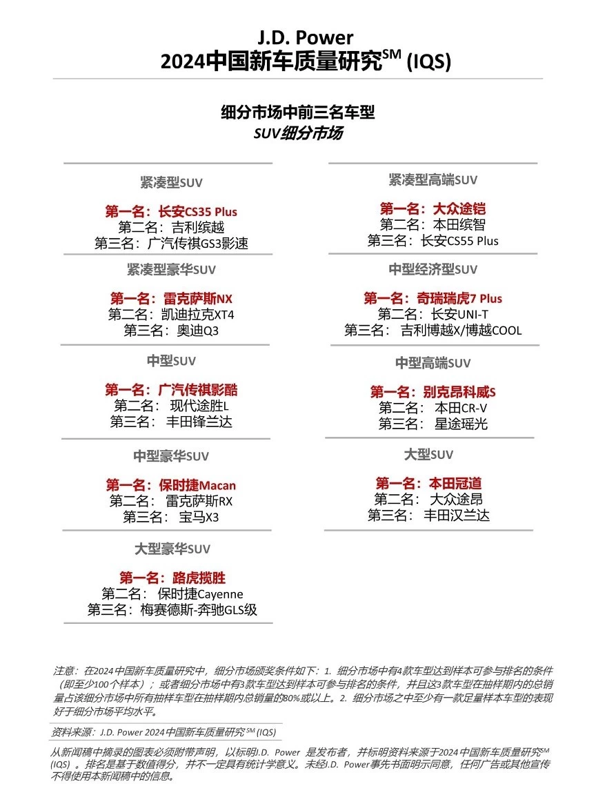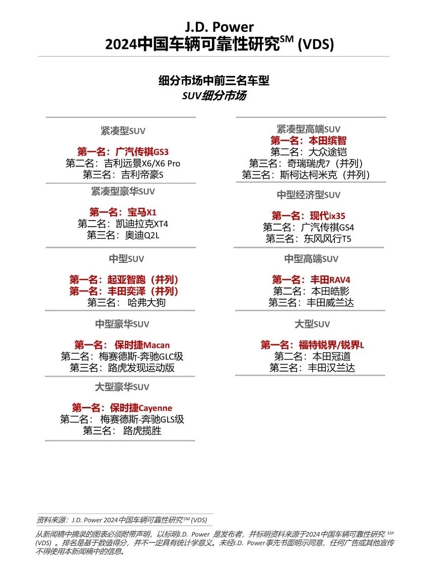 J.D. Power中国车辆可靠性研究进入中国市场15年。该研究衡量的是拥车期在13至48个月之间的中国燃油车车主在过去6个月中遇到的问题,涵盖9个问题类别。研究基于2020年1月至2023年6月之间购车的33,317位车主的真实反馈,覆盖44个品牌的229款车型。总体可靠性由平均每百辆车问题数(PP100)来衡量,分数越低表明质量越好。2024年行业整体问题抱怨数为190个PP100,集中在信息娱乐系统设计过繁以及故障类问题。保时捷(147个PP100)以其稳固的品牌可靠性荣获豪华品牌可靠性第一。其中,保时捷Macan及Cayenne车型分获中型豪华SUV和大型豪华SUV细分市场可靠性第一名,证明了两款车型的过硬品质和长期价值。