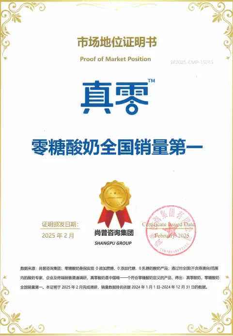 “健康生活”意识的不断增强,正引领越来越多的人加入“减糖行动”的大军,“精准控糖”理念也逐渐成为新消费领域的主流趋势。在这一股新风尚下,真零酸奶凭借将“控糖进行到底”的产品理念,实现了增量市场的抢占,成为酸奶行业的逆势标杆,强势斩获尚普咨询“真零零糖酸奶全国销量第一”市场地位证明,不仅进一步巩固了其行业领导地位和品牌硬核实力,更彰显了其在技术创新、产品品质及市场推广等领域的卓越成就。