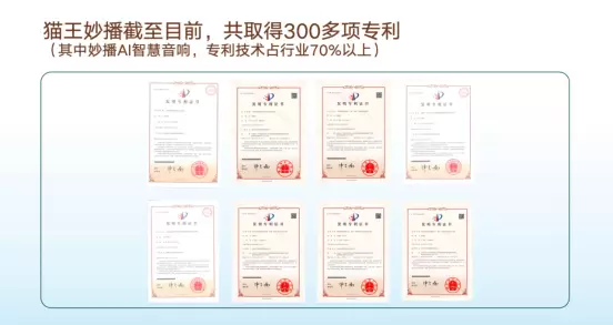 猫王妙播不仅在产品创新上持续突破,更在知识产权布局和行业标准制定方面深耕多年。截至目前,猫王妙播已累计获得300余项国内外专利,其中猫王妙播 AI 智慧操作系统的核心技术专利在同领域里占比近70%。这一强劲的专利储备不仅是技术实力的象征,更为猫王妙播在 AI 智慧音响领域构筑了坚实的技术壁垒。