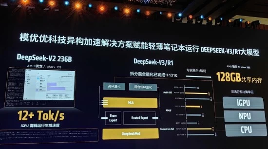 在现场,模优优科技(MoYoYo)就特别介绍了他们的异构加速解决方案,通过综合利用AMD锐龙处理器的CPU、GPU、NPU三大模块,灵活分配计算负载,可以在轻薄本上运行DeepSeek-V3/R1大模型。