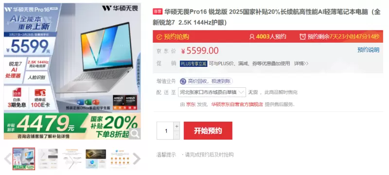 标配16英寸高分辨率、高色域、高亮度2.5K 144Hz亮彩护眼好屏,观影创作一流。高频内存+高速SSD、高清红外摄像头、丰富接口等周边配置也足额给到,选购价值超高。3月19日预约开启,国补补贴后华硕无畏Pro16 锐龙版2025仅4479元(咨询店铺客服了解补贴详情)。
