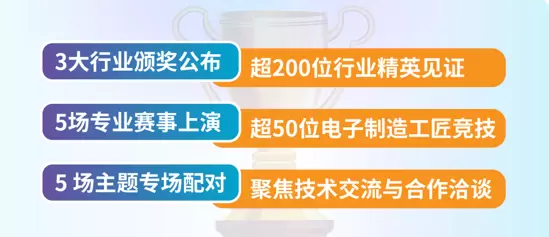 此外超10位专家与达人将现场揭晓百万流量奖,以AI+新媒体的创新形式互动亮相,深筑连接纽带。展会还将举办5场专业赛事,超50位电子制造工匠同台竞技,全面展示表面贴装、焊接、板级故障分析与维修、自动化、半导体、线束线缆等领域的精湛技艺。