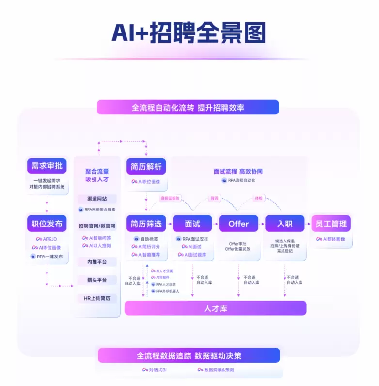 系统不仅能从人才库中挖掘高匹配候选人,还能根据求职者简历反向推荐岗位,覆盖官网和内推场景。