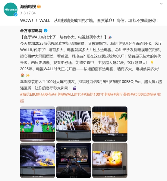 近日,海信电视微博官宣“WOW!!WALL!从电视墙变成‘电视’墙,画质革命!”,为即将到来的AWE2025提前预热。届时海信将携最强百吋级阵容亮相上海,为行业和用户带来一场视觉与科技的盛宴。除了展示其在超大屏电视领域的最新创新成果,同时也向全球消费者传递一个信号:百吋+电视的时代已经到来。