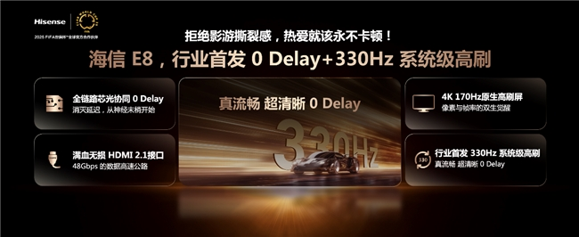 此外,海信E8Q Pro全球首发原生4K 170HZ+HSR 330Hz高刷技术,确保画面极致流畅。海信还搭载了低蓝光和无频闪技术,避免画面抖动和闪烁现象,能够有效避免眼疲劳问题,从而真正做到“100吋近距离舒适观看”。