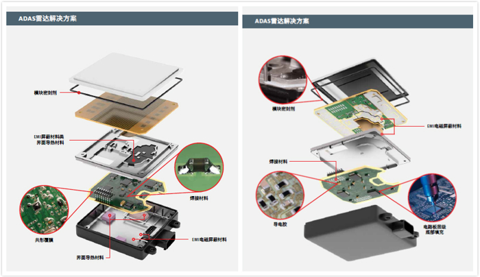 “看得远”——雷达/激光雷达系统 雷达收集到的数据,可以提高汽车主动安全性能。为此汉高提供高效能的热管理以及电磁屏蔽解决方案,保证雷达内的电子元器件的可靠性与长效性。