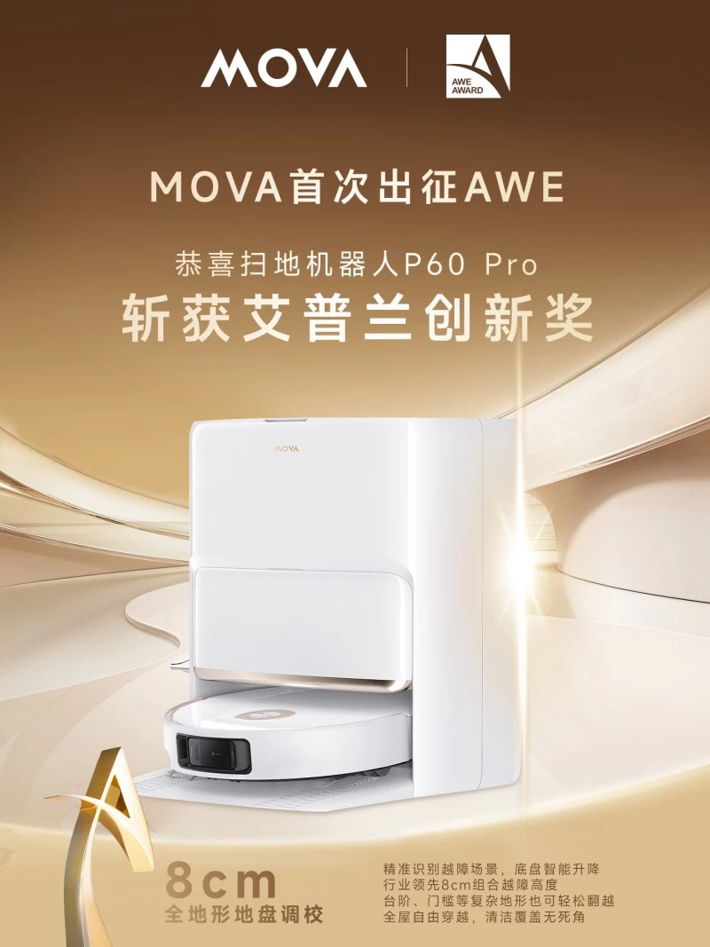 在全球家电与消费电子行业的年度盛会——AWE2025(中国家电及消费电子博览会)上,MOVA P60 Pro扫地机器人凭借其卓越的技术创新与卓越性能,成功荣获艾普兰创新奖。这一奖项不仅代表着行业专家对MOVA P60 Pro 突破性清洁技术的高度认可,也彰显了MOVA品牌在智能家居领域的持续领先地位。