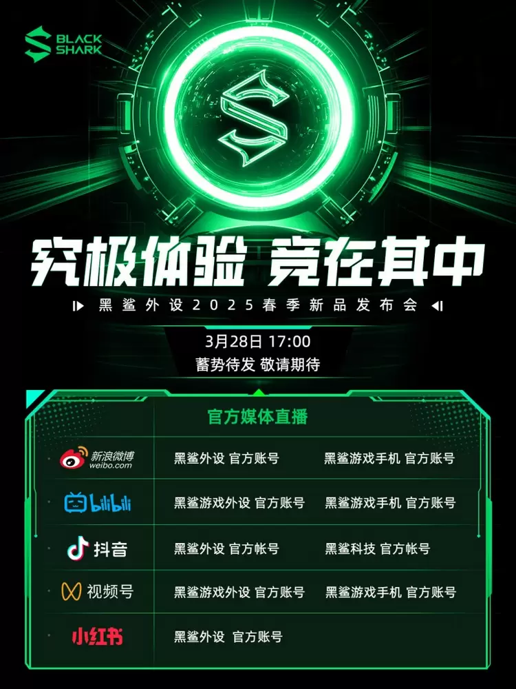 据可靠消息称,电竞外设领域的创新引领者——黑鲨外设,正式官宣将于2025年3月28日17:00召开主题为“究极体验,竞在其中”春季新品发布会。据悉,此次新品发布会将于黑鲨游戏外设和黑鲨游戏手机官方平台同步直播,(详情可点击篇尾链接)为玩家粉丝们揭开新一代旗舰产品的神秘面纱,开启电竞外设的“究极进化”时代。